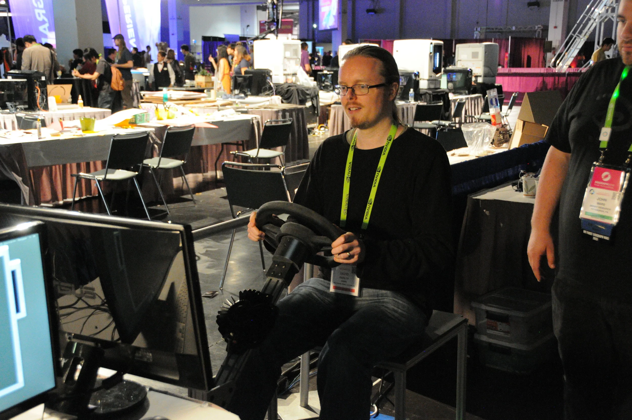 As part of our SIGGRAPH 2016 studio-workshop, we presented a driving simulator we call The Haptic Kart. The Haptic Kart is a driving game made in Unity, paired with a haptic ride seat. The game generates situational haptics in the foot wells, seat, and steering column. Different sensations are used for different road surfaces and obstacles, and the actuators in the foot wells of the Kart can be operated independently, biasing feedback to one side or distributing it evenly.