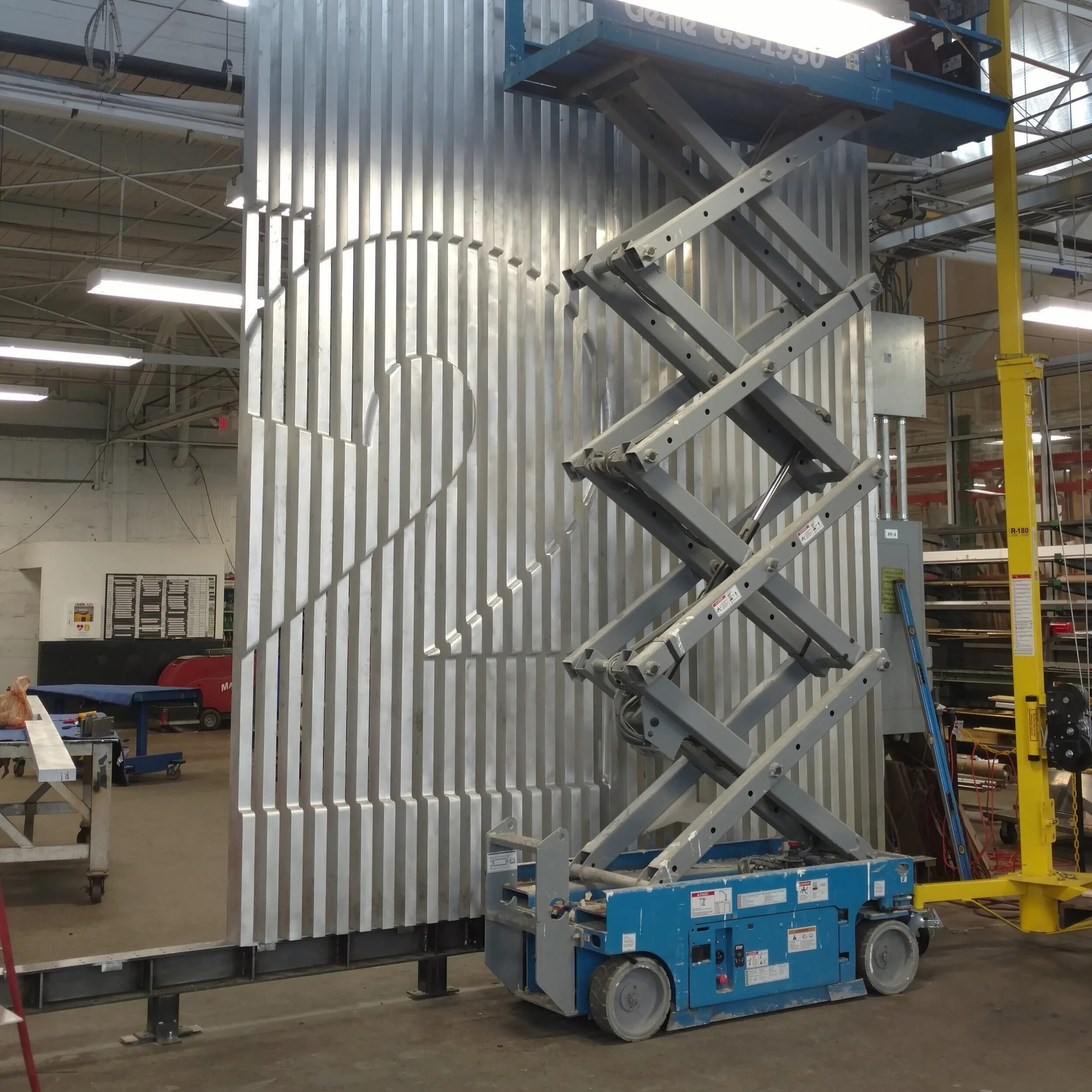 2018 - Embossed louver signage for Take Two Interactive Software, owners of 2K Games and Rockstar Games. Amuneal was contracted by Infinite Metal & Glass to Design Engineer and fabricate the office’s outdoor signage. This main sculptural sign is machined from 1” x 6” x 20’ 1060 Aluminum Bar, with custom 1/2” steel base with scribed cladding, and structural tiebacks at the top.